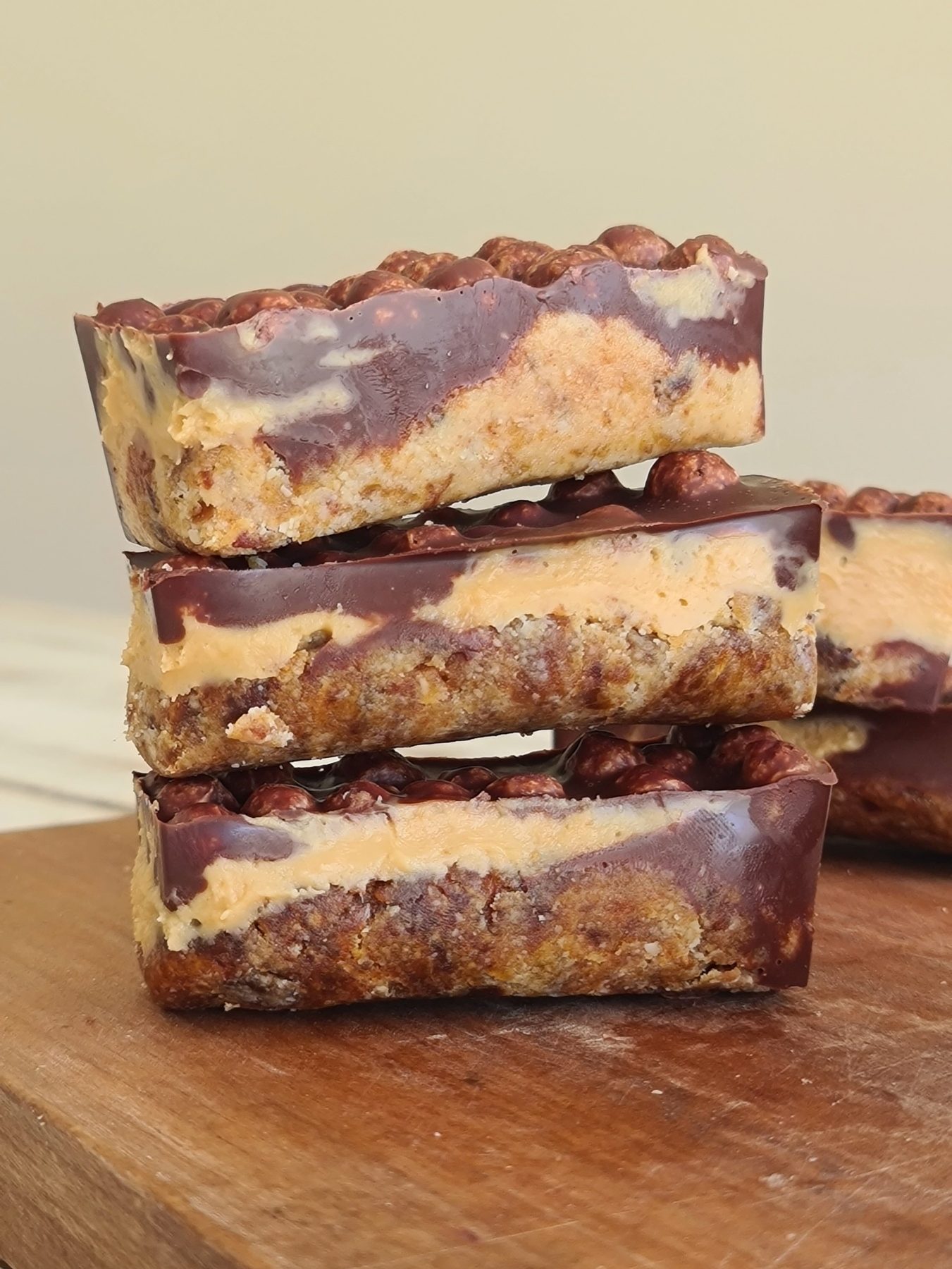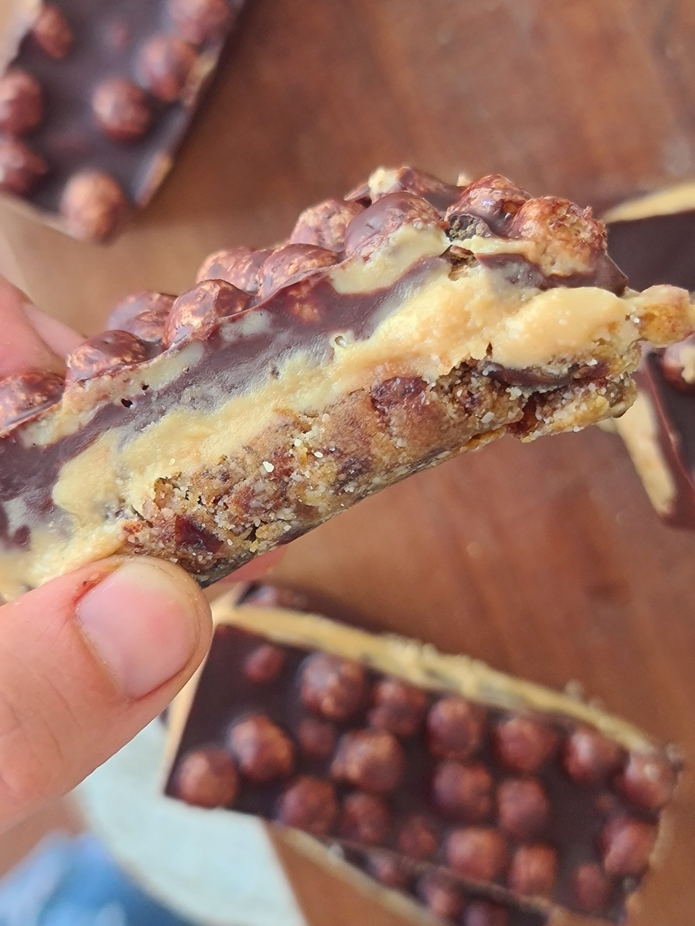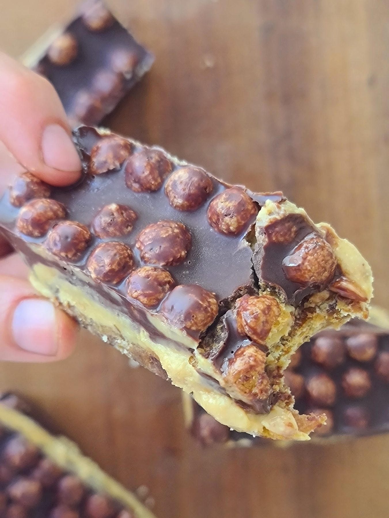 Lleva dátiles al microondas, 1 minuto y luego muele fácilmente con un tenedor, hasta tener una pasta. Agrega harina, mezcla y haz base de tus barritas en moldes o en una fuente grande con papel mantequilla. Incorpora capa de mantequilla, luego nuestra quínoa XL. Finaliza con chocolate Riwün, previamente derretido y refrigera